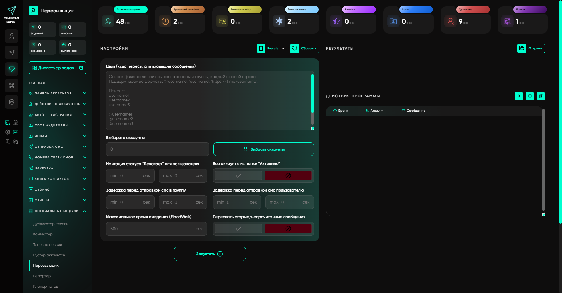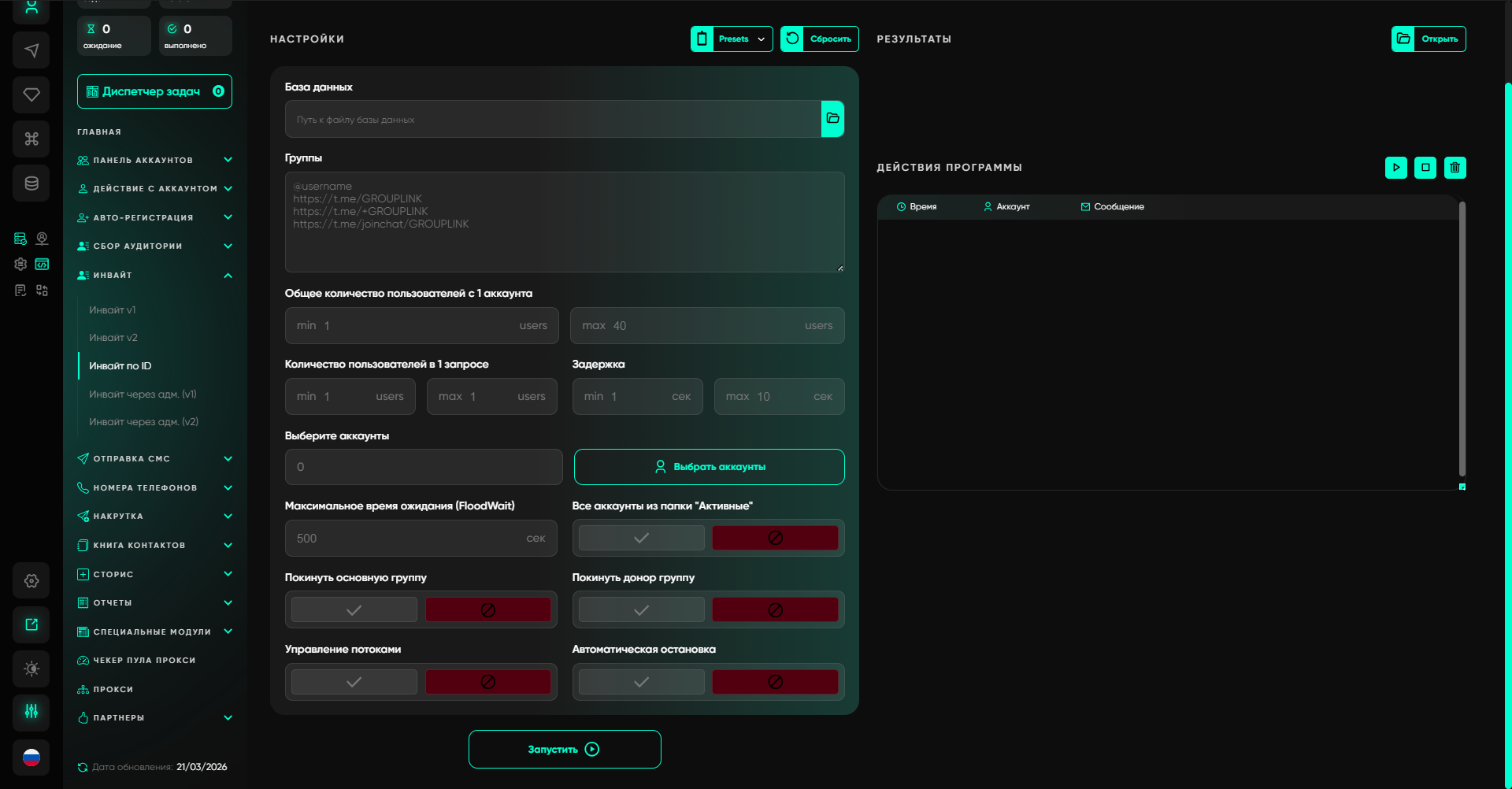 Скорость. Задачи, на которые уходит 40 часов ручной работы, софт выполняет за 2 часа. Регистрация 100 аккаунтов через 10+ SMS-провайдеров с автоподстановкой кода и 2FA запускается заданием и идёт в фоне. Сбор активной аудитории (писавшие в чат за последние 30 дней, комментаторы) — нажали кнопку, база готова.