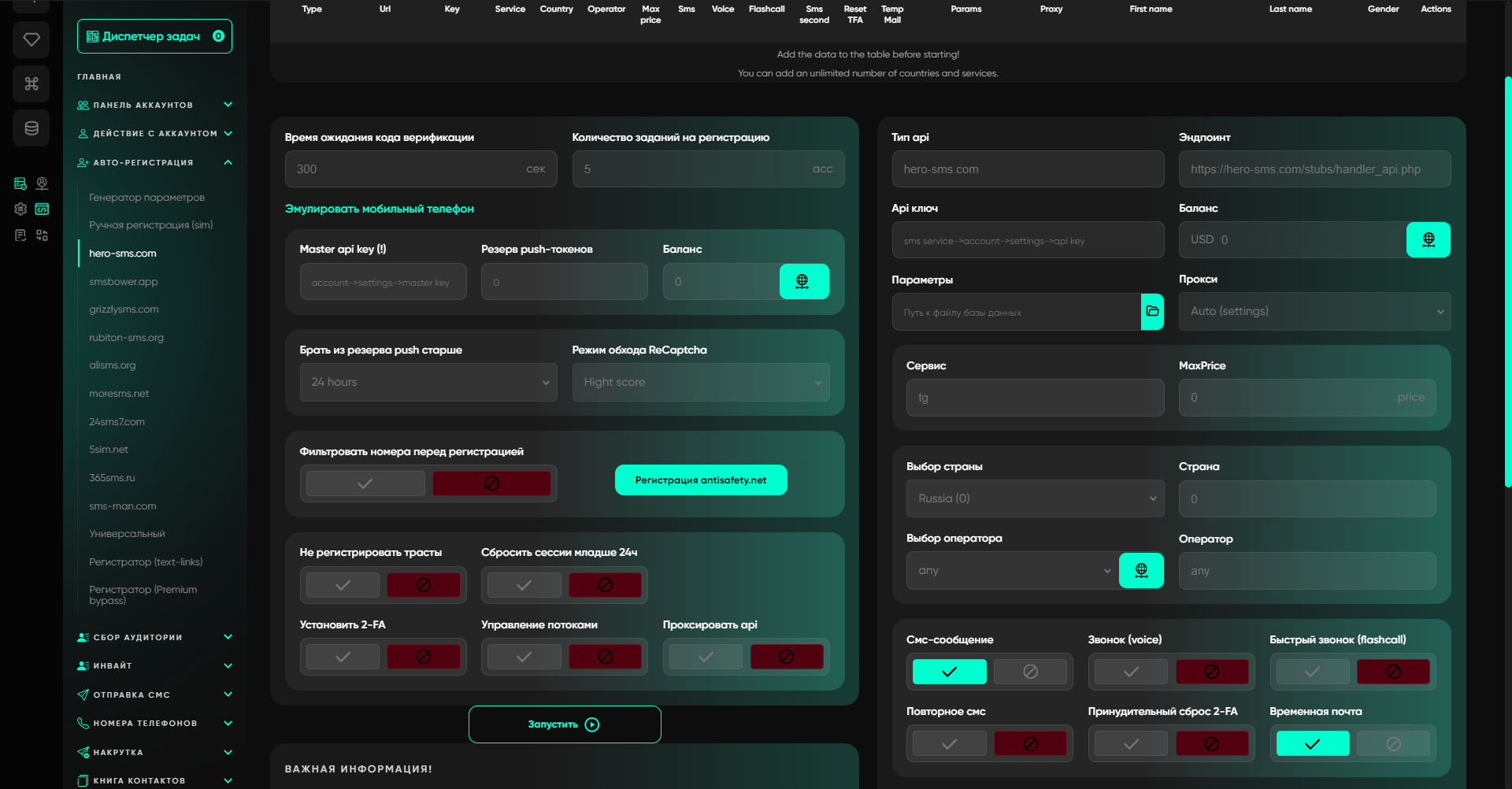 Регистрация аккаунтов. Ручная регистрация десятков аккаунтов через SMS-подтверждения трудоёмка. Требуется автоматизация через сервисы виртуальных номеров с поддержкой разных регионов и способов получения кода (SMS, звонок, flashcall).