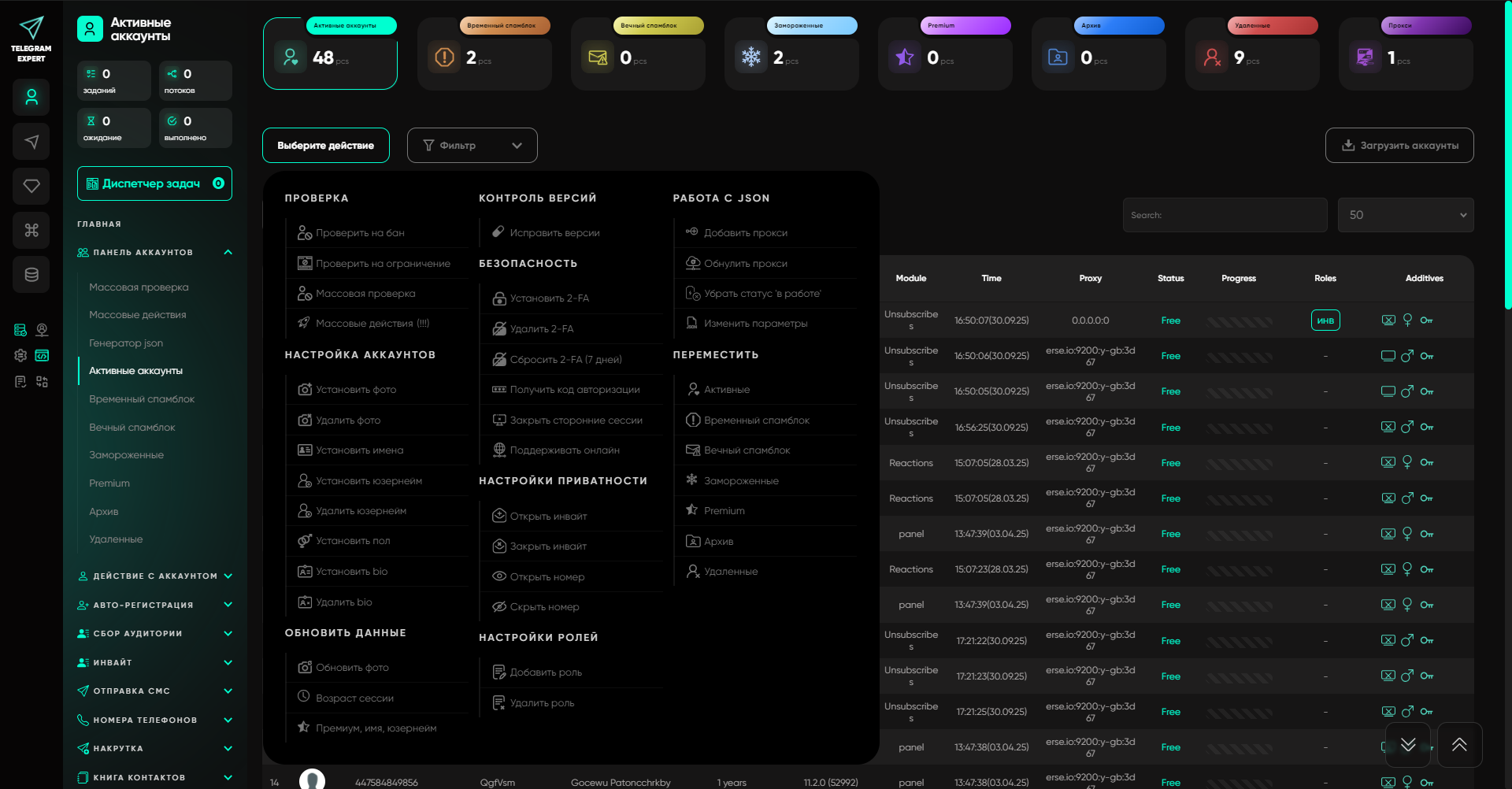 Управление множеством аккаунтов. Необходимо распределять аккаунты по статусам (активные, в спамблоке, замороженные), массово проверять их на бан, менять профильные данные (фото, bio, username, 2FA) с рандомизацией для избежания паттернов.