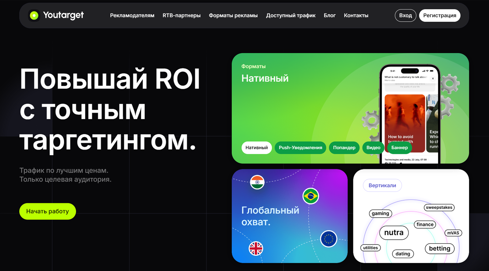 Youtarget — платформа для тех, кто выстраивает системную работу с Pop, Push и Native трафиком. Прямые источники, простые настройки, автоматизация и открытая аналитика создают предсказуемые условия для тестирования и роста.