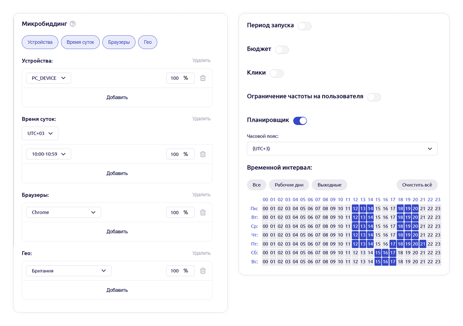Таргетинг с выбором ГЕО, видом устройства, операционной системы и браузера