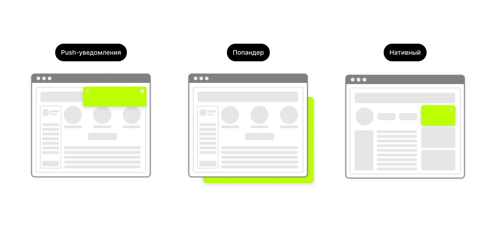 Поскольку Apple ограничивает стандартные пуши, появился формат In-Page Push. Это стилизованный под уведомление баннер, который всплывает прямо на странице сайта. Он работает на всех устройствах (включая iOS) и не требует предварительной подписки пользователя.